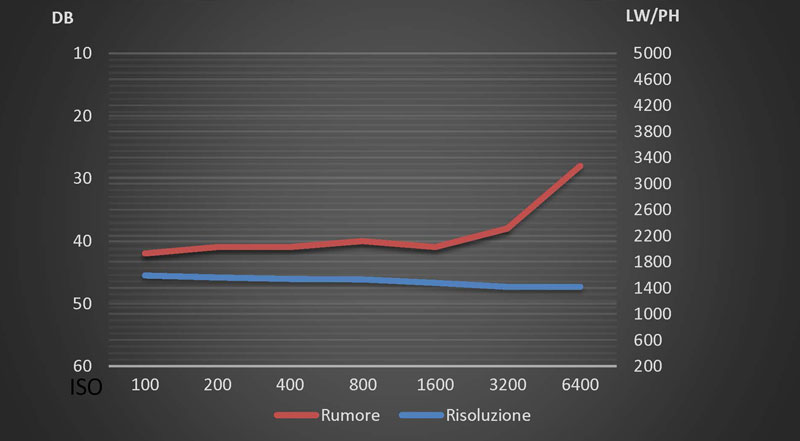 L’immagine dall’ottica tele f/2.4 (con una costruzione a 5 lenti) con sensore da 13 Mpxl ha una risoluzione abbastanza bassa, costante fino agli 800 ISO ma che poi cala drasticamente già dai 1600 ISO. Il rumore qui è molto alto e diventa molto fastidioso e visibile sul file proprio a partire da 800 ISO. Qui si nota molto il differente lavoro del processore Qualcomm Snapdragon 870: sensore e ottica sono le stesse di Find X3 Pro ma il risultato è molto differente.