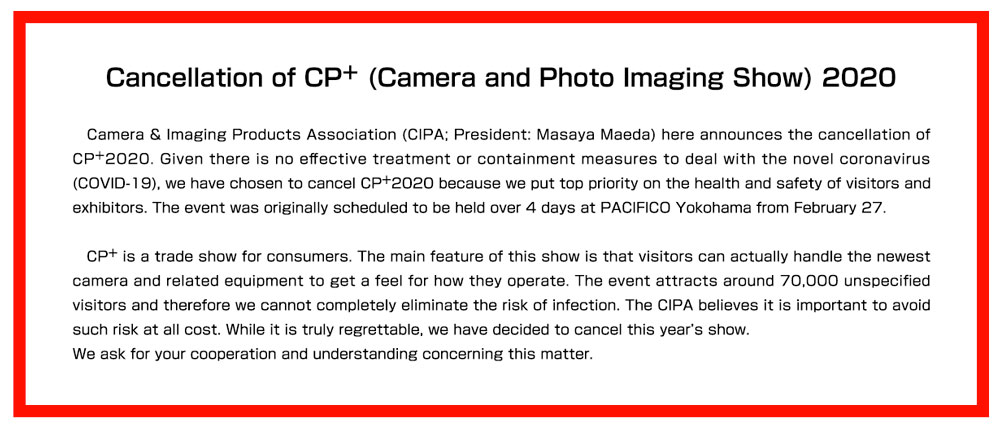 “Given there is no effective treatment or containment measures to deal with the novel coronavirus (COVID-19), we have chosen to cancel CP+2020 because we put top priority on the health and safety of visitors and exhibitors.”