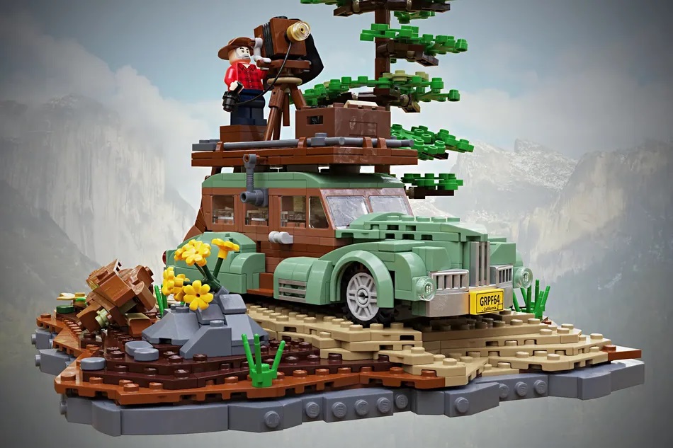 Nick Micheels è un appassionato di natura e fotografo paesaggista che si ispira al lavoro dei fotografi Magnum. La piattaforma Lego Ideas poco tempo fa ha chiesto ai suoi membri di inventare un nuovo set legato alla natura ed è qui che a Nick è forse balenata in testa l’idea di riprodurre un famoso scatto di Cedric Wright: incontrò Ansel Adams durante un’escursione negli anni ’20, divennero amici e poco tempo dopo gli scattò un ritratto nel Parco Nazionale di Yosemite, dove si vede il fotografo in piedi sulla piattaforma della sua station wagon con la sua grande formato 8×10.