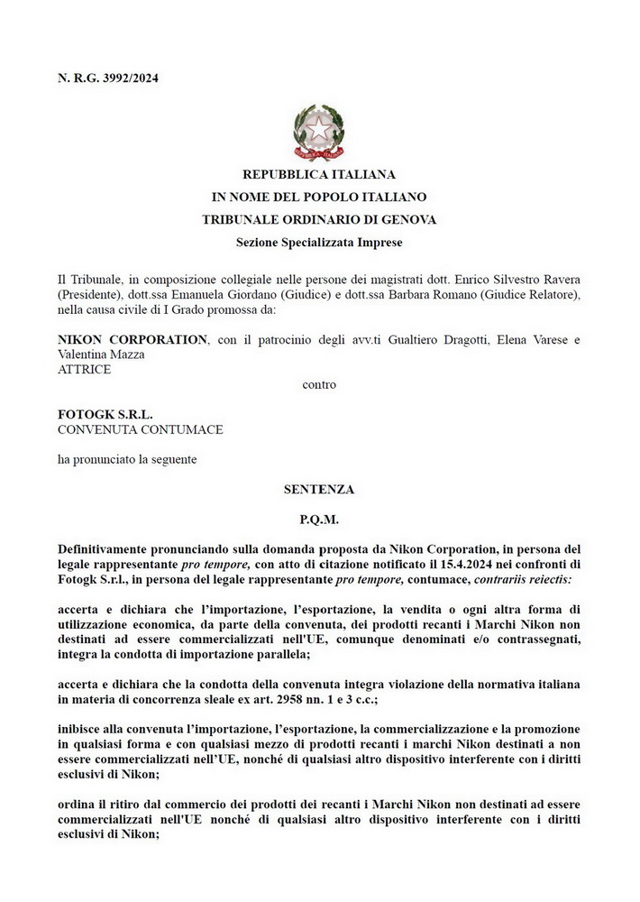 Giunge ad una sentenza di condanna il procedimento di Nikon Corporation contro Fotogk Srl, accertando e dichiarando che l’importazione, l’esportazione, la vendita o ogni altra forma di utilizzazione economica, da parte di Fotogk, dei prodotti recanti i Marchi Nikon non destinati ad essere commercializzati nell’UE, comunque denominati e/o contrassegnati, integra la condotta di importazione parallela.