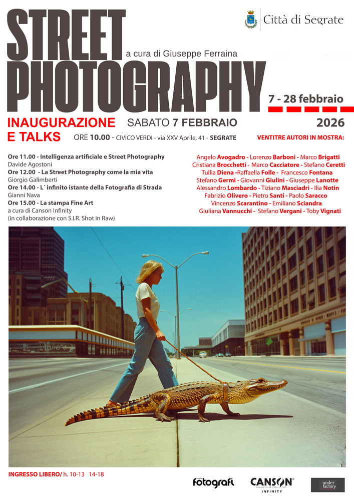 Sabato 7 Febbraio a partire dalle ore 10.00, allo spazio espositivo Civico Verdi di Segrate, in via XXV Aprile, 41, si terranno 4 talks e la presentazione della mostra collettiva “Street Photography” a cura di Giuseppe Ferraina, giornalista e critico.