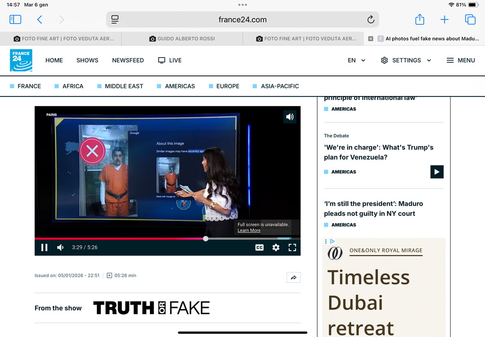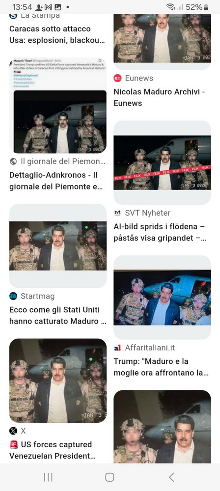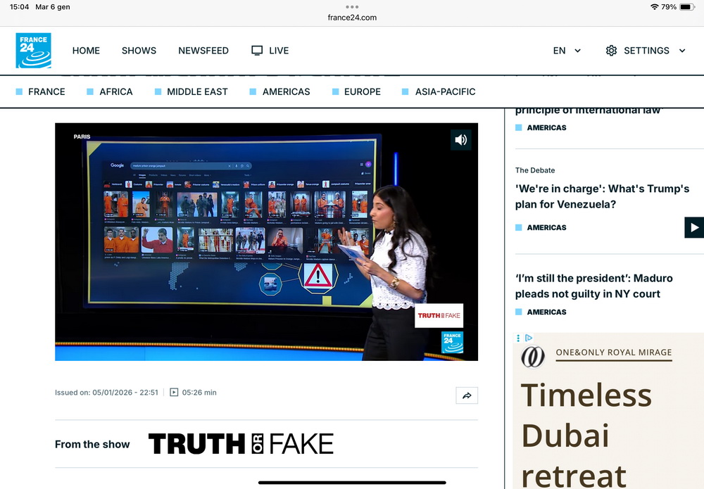 La spiegazione viene dall’autorevole telegiornale France24 (il filmato è visibile su France24.com) che ha scoperto come tutte le foto siano dei “fake”, tutte realizzate con AI. Anche quella di Maduro con la benda sugli occhi postata da Trump e utilizzata perfino dal New York Times.